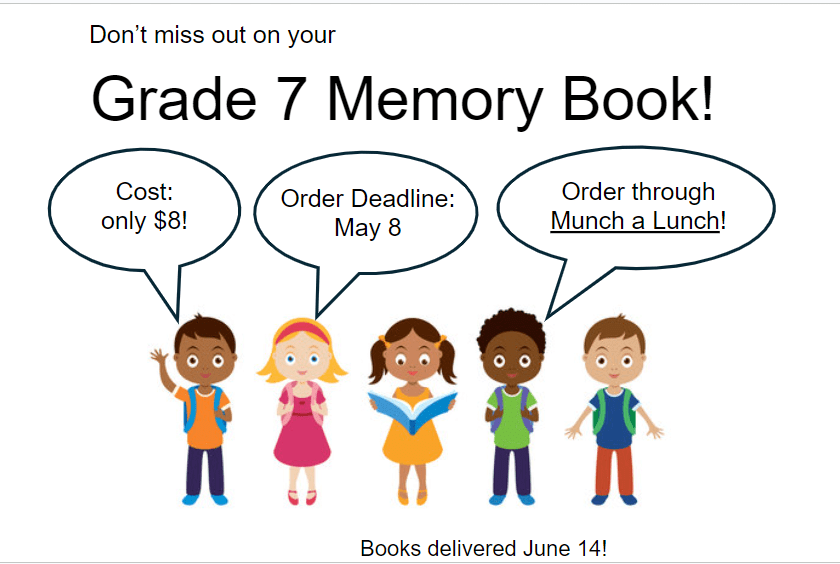 Grade 7 Memory Book order due May 8th (extended to May 10th)!